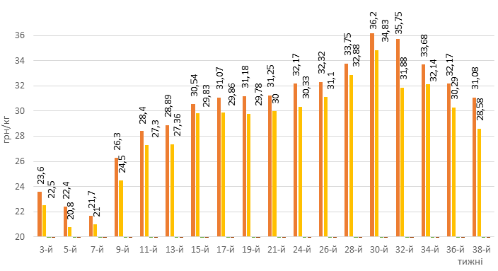 Во второй половине сентября средняя закупочная цена на свиней первой категории продолжает вплотную приближаться к психологической отметке в 30 грн/кг. Нижний порог ценового диапазона на свиней второй категории уже пересек эту границу: килограмм такой свинины на 38-й неделе закупали по 27,5-31,5 грн, однако средний показатель в большей степени тяготеет к ценовому минимуму. Цены закупки мясной свинины варьируют в узком коридоре (от 30 до 32,5 грн), поэтому разрыв между средними ценами на упомянутые категории увеличился.