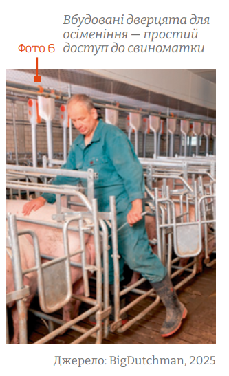 Інтегровані двері для осіменіння суттєво спрощують роботу персоналу. Передні та дверні елементи працюють як підйомні ворота, а відкрита конструкція станка забезпечує хороший огляд для обслуговуючого персоналу (фото 6). Гумові шумопоглиначі забезпечують тихе відкривання та закривання, що знижує рівень шуму у приміщенні. Ширина станків регулюється від 600 мм до 700 мм, що дозволяє підібрати оптимальний варіант для різних порід.