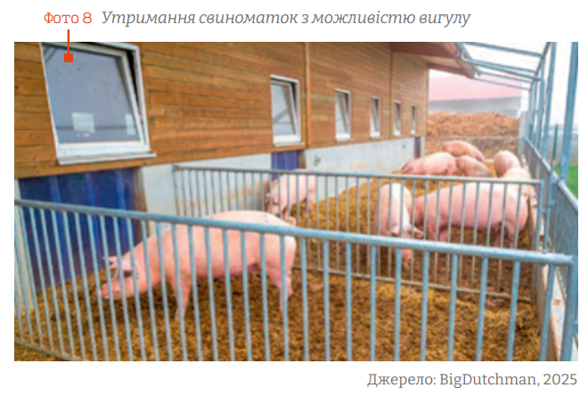 Одним із кроків підвищення благополуччя тварин є можливість вигулу. Вигульний майданчик можна поєднувати з будь-яким типом системи утримання та годівлі. Він дозволяє розмежувати функціональні зони відпочинку, годівлі та активності. Водночас свині отримують додаткові стимули для руху та гри, а також більше простору (фото 8). Крім того, вигульний майданчик створює відмінну кліматичну зону, яка відрізняється від теплого приміщення, покращуючи здоров'я та благополуччя тварин.