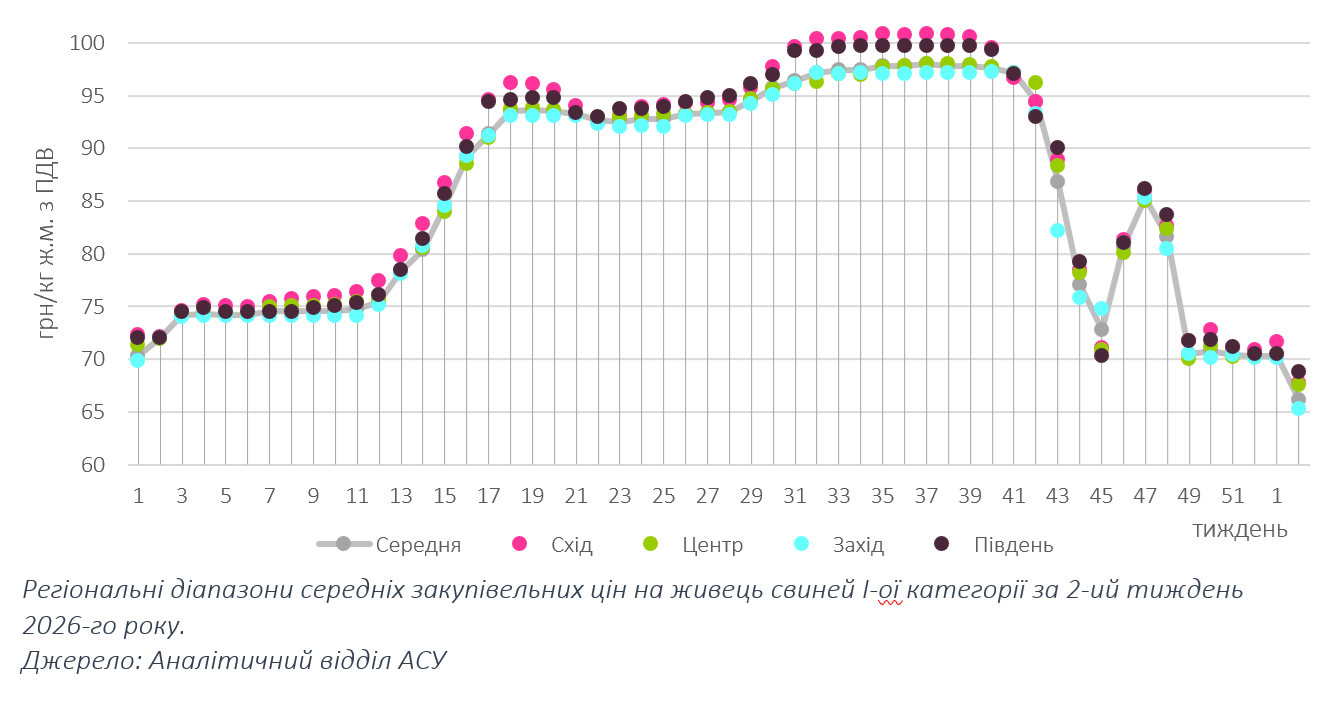 Після п’ятитижневого плато у кінці року перші торги січня завершилися послабленням закупівельних цін на живець свиней. Так, цього тижня більшість товарних партій закуповують в діапазоні 65–68 грн/кг, а середньозважена ціна зупинилася на рівні 66,1 грн/кг. Це на 5,9% чи 4,2 грн/кг поступається показнику минулого тижня.