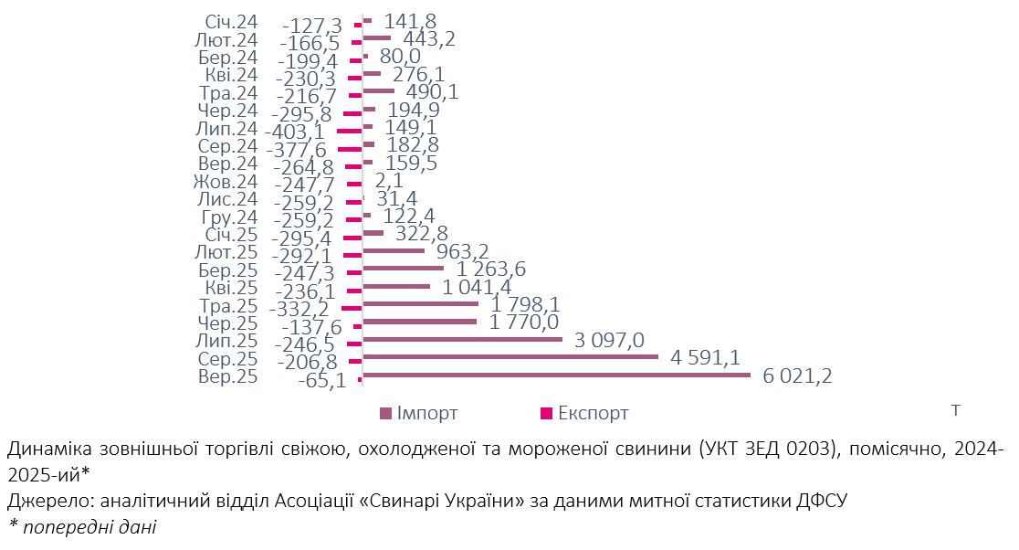 «Оскільки цьогоріч сезонне зменшення внутрішньої пропозиції свинини співпало із наслідками скорочення поголів’я свиней в країні, ціни на українську свинину помітно вищі та тривалий час залишаються на стабільно високому рівні. Натомість середня митна вартість імпортованої свинини у вересні знизилася до 2,56 дол. США/кг (-2,2% проти серпня). Оскільки абсолютну більшість такої продукції надходить з країн ЄС, вичерпання квот для безмитного завезення заохочувало частину операторів формувати запаси продукції до вимушеного „здороження” через митні тарифи».