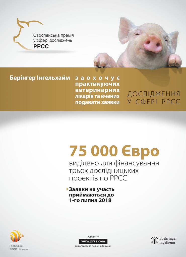 Вп’яте компанія Берінгер Інгельхайм виступає спонсором «Європейської премії у сфері досліджень РРСС» (European PRRS Research Award) для підтримки прикладних досліджень з метою покращення контролю РРСС (репродуктивно-респіраторного синдрому свиней). Заявки на участь у «Європейській премії у сфері досліджень РРСС 2018» прийматимуться до 1 липня.