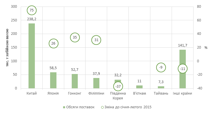 Варто зазначити, що лише на три основні країни збуту — Китай, Японію та Гонконг — припало більш ніж 60% експортованих обсягів. Так, до Піднебесної реалізували 238 тис. т продукції свинарства, що на три чверті перевищує обсяги поставок у перші два місяці минулого року. Питома вага відвантажень до Японії та Гонконгу не перевищила 10% та 9%. Але їх обсяги зросли більш ніж на чверть та третину відповідно. Активніше торгували і з Філіппінами, куди реалізували майже 34 тис. т продукції свинарства — на 31% більше ніж торік. Особливу увагу приділили і співпраці з в’єтнамським контрагентами: так за перші два місяці року до цієї країни поставили 10,98 тис. т (більше чверті обсягів експортованих за весь 2015-й).