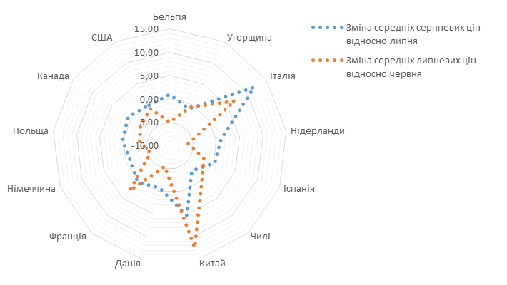 Рисунок 2. Зміни середніх цін на свинину у липні та серпні 2015-го у різних країнах світу