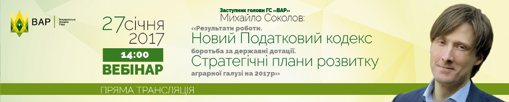 27 січня о 14:00 Всеукраїнська Аграрна Рада організовує вебінар, під час якого заступник голови ГС «ВАР» Михайло Соколов висвітлить найактуальніші питання, які наразі хвил...