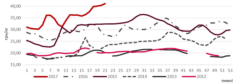 Динаміка закупівельних цін на живець свиней І-ї категорії (2012-2017 рр.)
