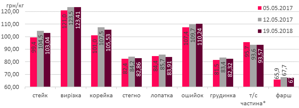 Тим часом, середня роздрібна ціна свининячих відрубів у кінці попереднього тижня трохи послабилася, порівняно з початком другої декади травня. Так, майже на 2 грн/кг подешевшала корейка, а лопатка втратила 2% чи 1,75 грн/кг. Ціна стейку також послабилася та станом на 19-те травня склала 103 грн/кг (-1,4% за тиждень). Решта свинячих частин зазнали менш відчутної зміни роздрібних цін. Таке незначне послаблення може свідчити про поступову адаптцію роздрібних мереж до нових котирувань на ринку свинини та відповідь на реакцію споживачів на на оновлені цінники.