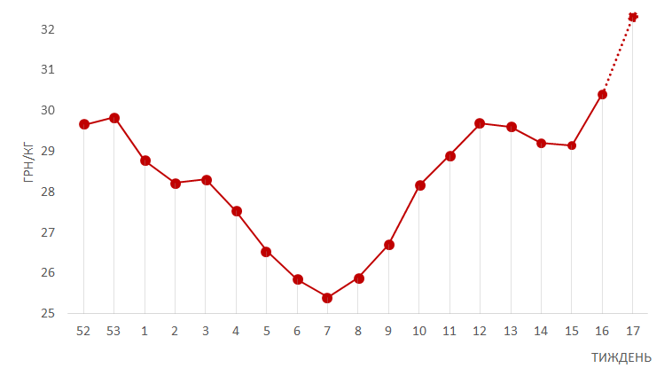 Упродовж 16-го тижня ціна на живець, у середньому, становила 30,4 грн/кг. Однак за тиждень до Великодня свинарі прогнозували подальший підйом: напередодні свята середня ціна на свинину живою вагою може перевищити 32 грн/кг.