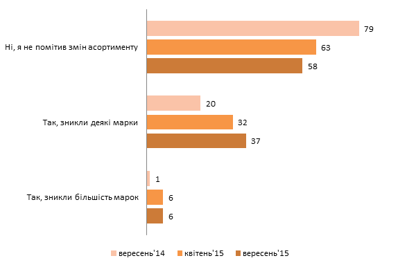 Роком раніше цей показник був рівно вдвічі менший (21%). Причому 37% відзначили зникнення деяких марок, а 6% — більшості звичних їм брендів. Такі дані опитування, проведеного дослідницьким холдингом «Ромир».