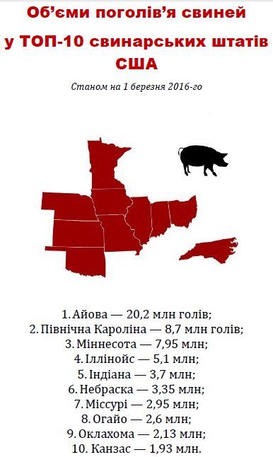 Згідно з березневим «переписом» свинопоголів’я, у США виокремилася десятка найпотужніших штатів-виробників. Так, в Айові, Північній Кароліні, Міннесоті, Іллінойсі, Індіані, Небрасці, Міссурі, Огайо, Оклахомі і Канзасі утримується 87% усіх свиней у країні. Такі дані оприлюднило Міністерство сільського господарства США.