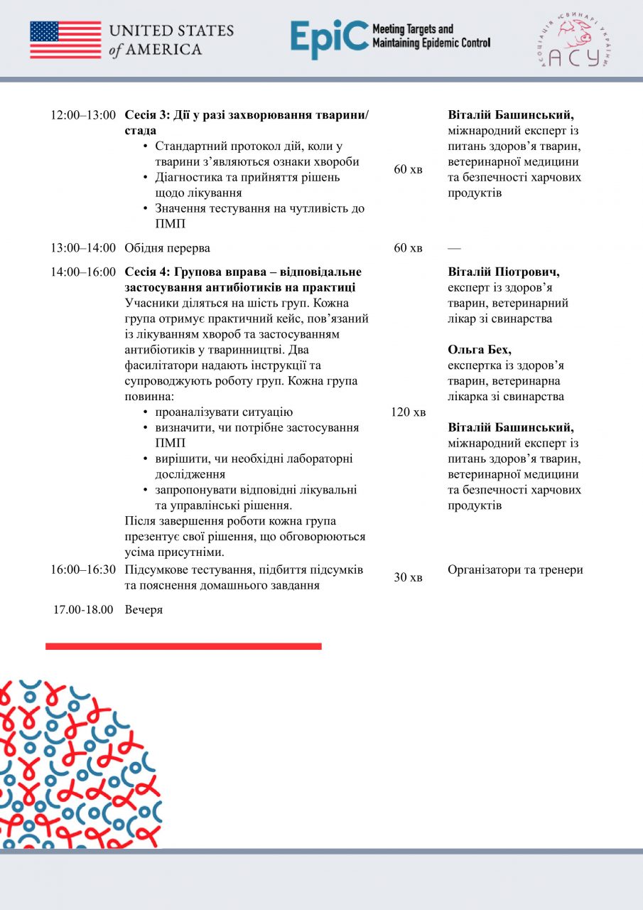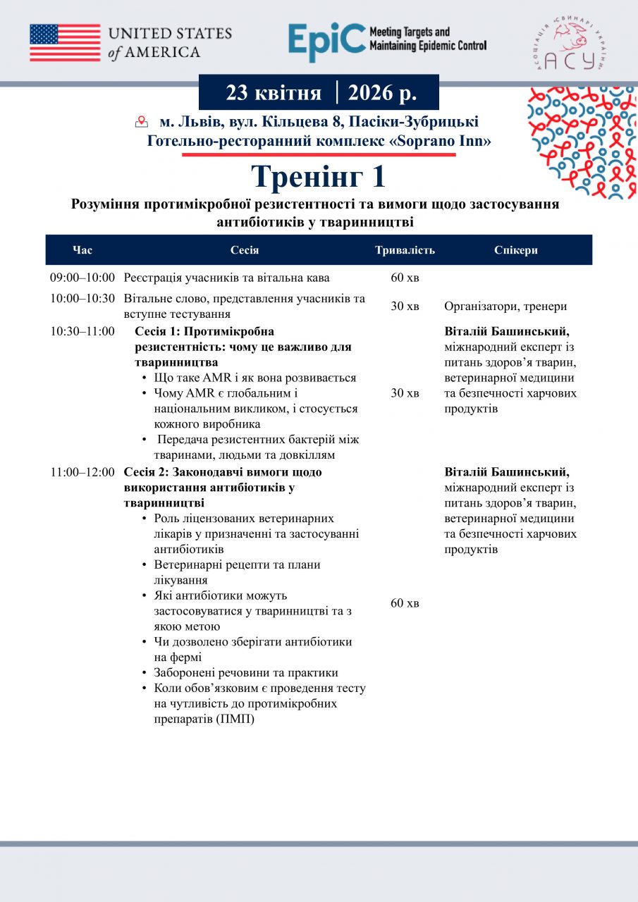 Ключова особливість тренінгу — практична робота з кейсами. Учасники в групах аналізуватимуть реальні виробничі ситуації, прийматимуть рішення щодо лікування та формуватимуть підходи до управління застосуванням антибіотиків на фермі.